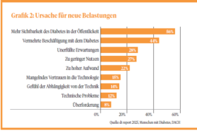 Outre les données démographiques, la durée de diagnostic et les formes de traitement, l’enquête anonyme recense les tendances, les problèmes non résolus et l’attitude à l’égard de la transformation numérique en général et des technologies du diabète en particulier. Près de 80 % des personnes interrogées atteintes de diabète de type 1 ont déclaré que les technologies pouvaient réduire les contraintes liées au diabète. Dans le même temps, environ 30 % ont indiqué que les technologies du diabète entraînaient de nouvelles contraintes. Cela montre clairement l’importance d’une formation complète, d’un accompagnement et d’une interaction harmonieuse et souhaitable entre tous les acteurs concernés dans les domaines de la santé, de l’industrie et de la politique. En Suisse, la cause la plus fréquemment citée pour expliquer les contraintes supplémentaires serait liée à la visibilité du diabète dans la société (voir graphique 2). Nous sommes donc encore loin d’avoir atteint notre objectif en matière de déstigmatisation du diagnostic du diabète.